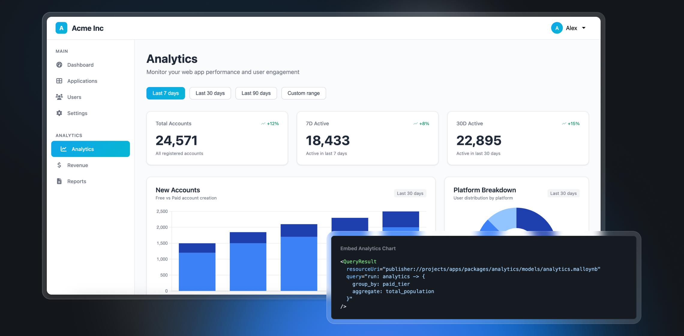 We also provide a full suite of components for more traditional embedded workflows. An analyst can create a report using our intuitive dashboard builder, and a developer can then easily embed it into your application. For deeper integrations, our powerful React SDK and flexible APIs give your team the building blocks to create any custom data experience you can imagine.
