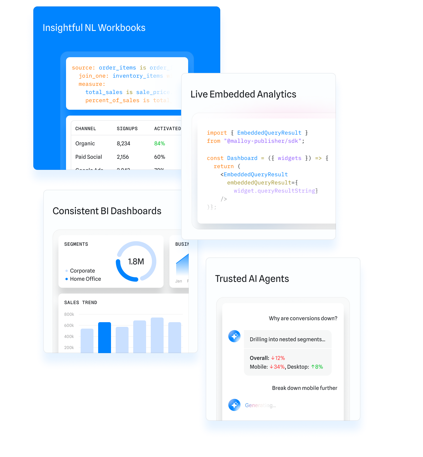 The Credible platform efficiently serves your semantic model as the source of truth—ready for dashboards, workbooks, embedded apps, and AI agents. Powered by Malloy, it’s readable by humans and LLMs, so every answer is consistent, explainable, and trusted.