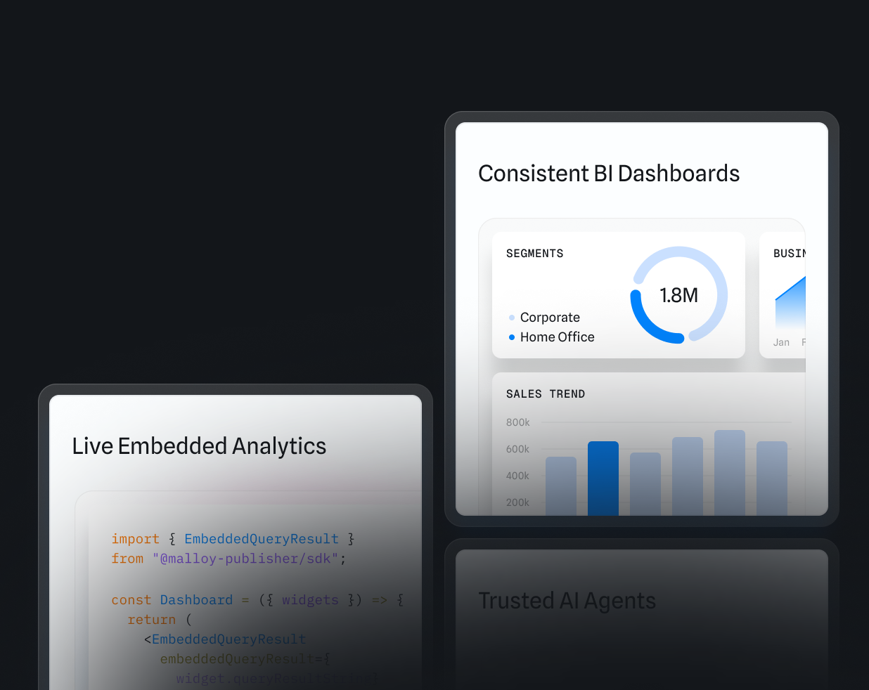 Start by building the reliable, consistent dashboards your business runs on. For teams that love their existing tools, our platform can serve as a consistent semantic layer. Connect existing BI tools via our SQL API and ensure every report across the company is powered by the same set of verified facts.